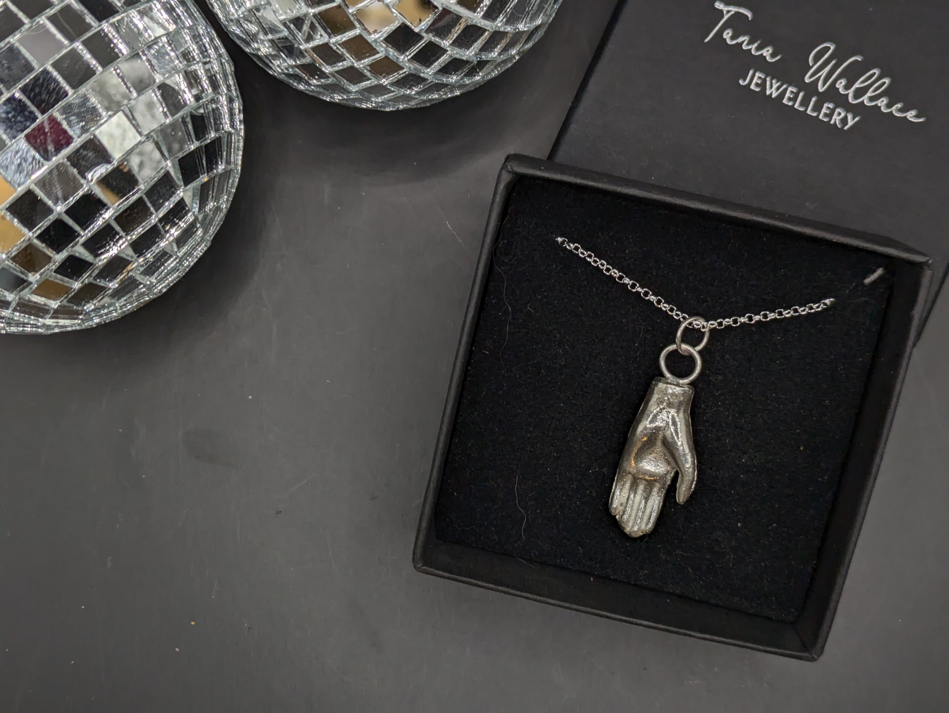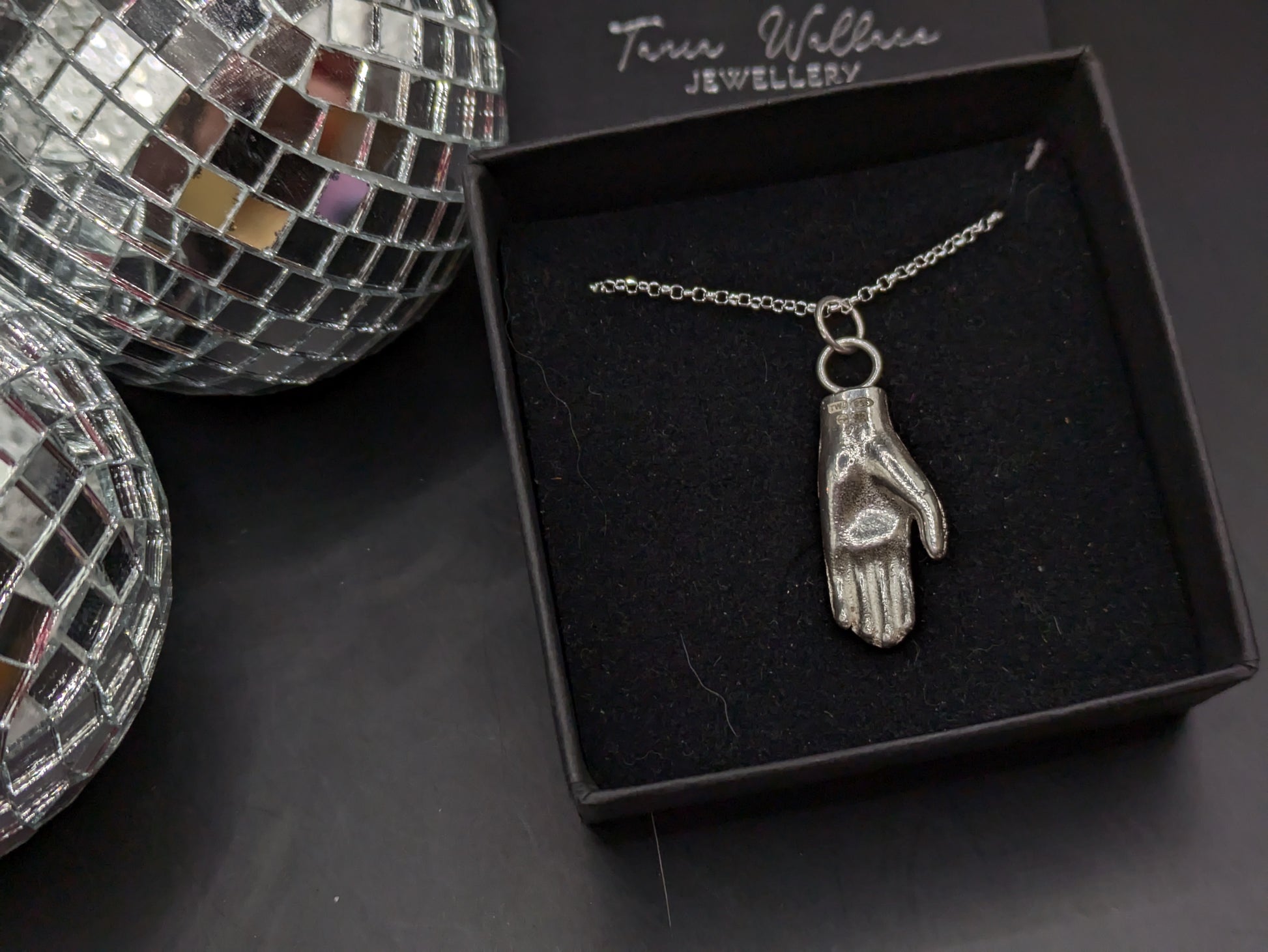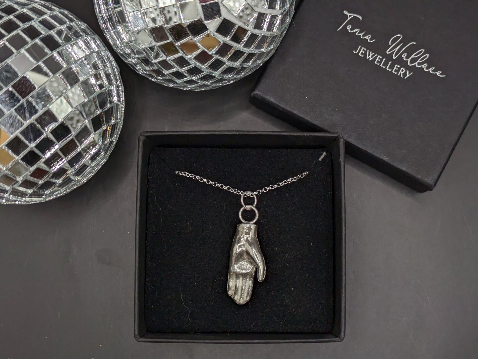 Sand cast solid silver pendant cast from the hand of a child's toy doll.