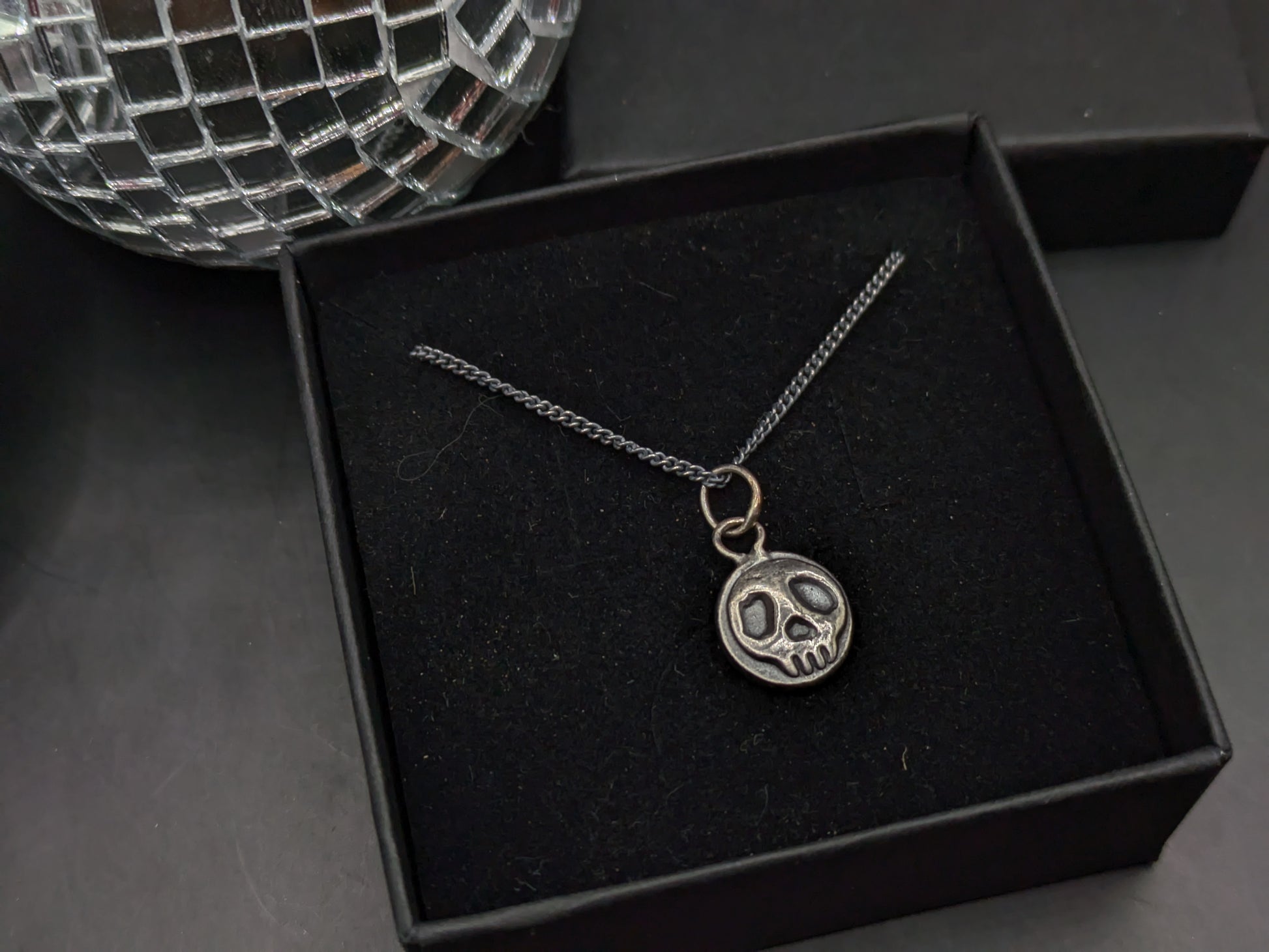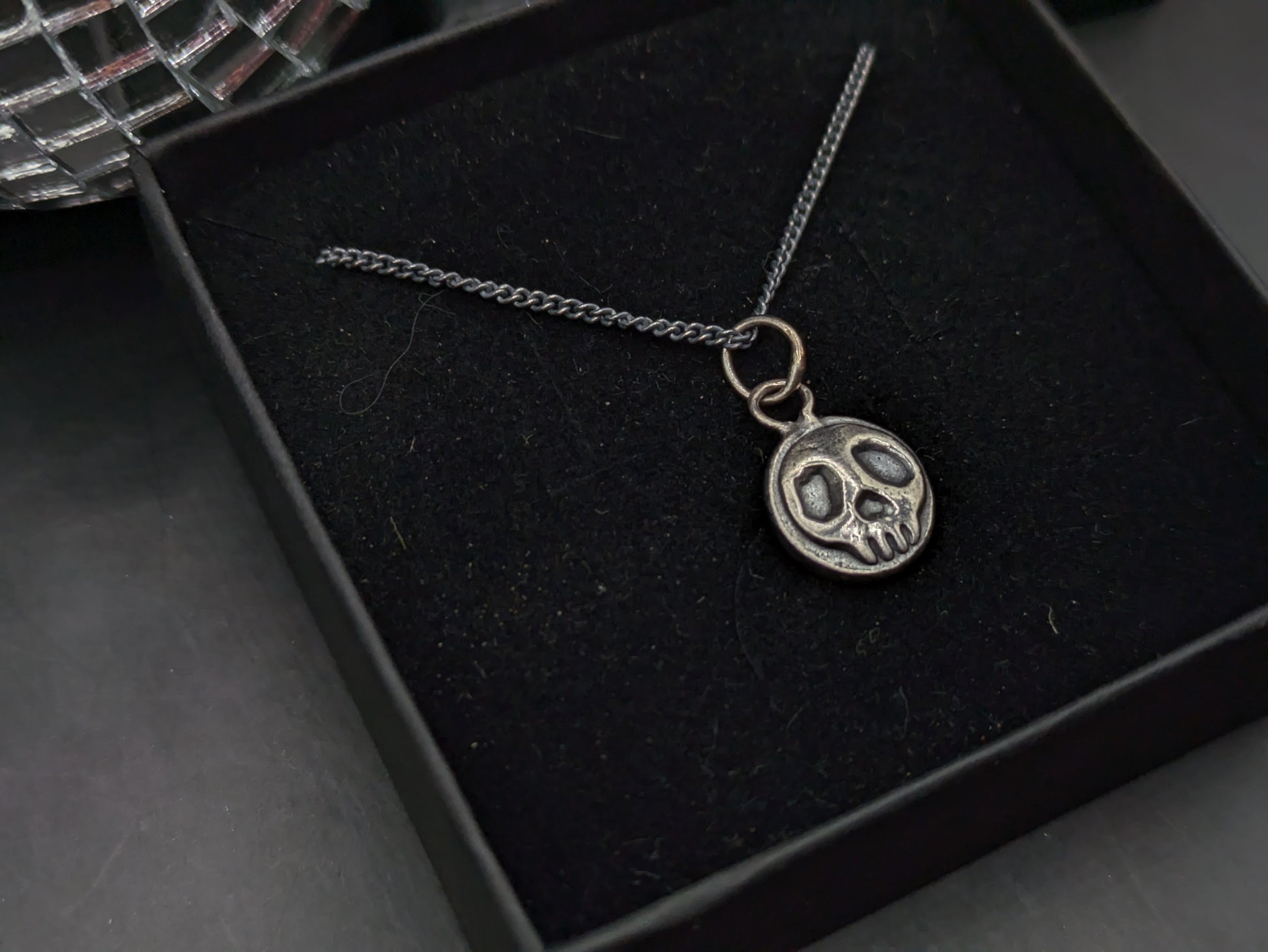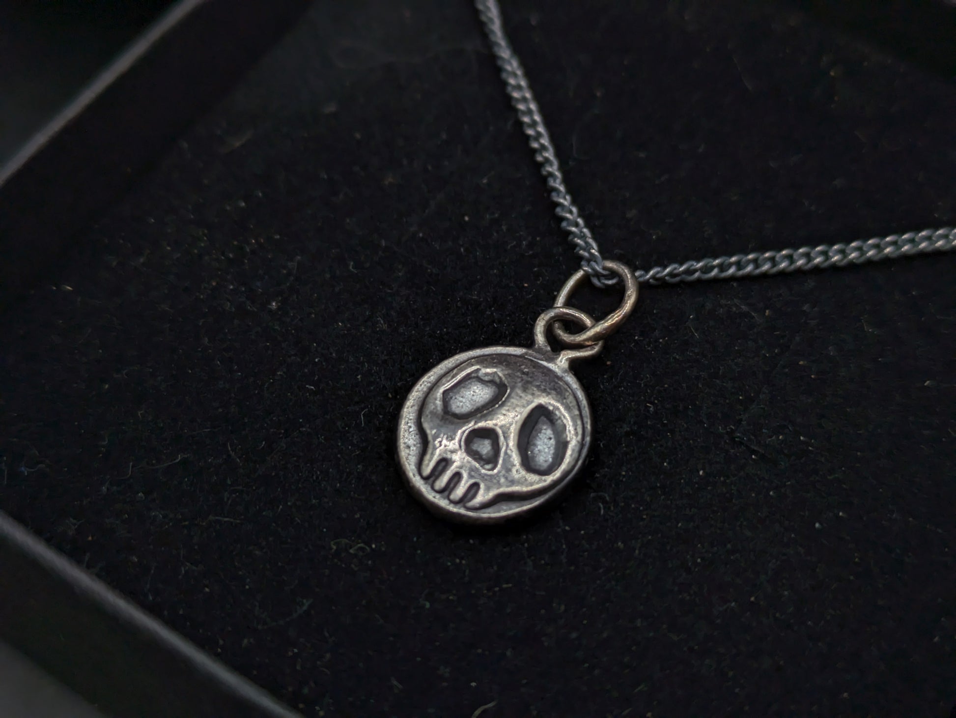 Hand pressed solid silver skull pendant on a sterling silver chain.