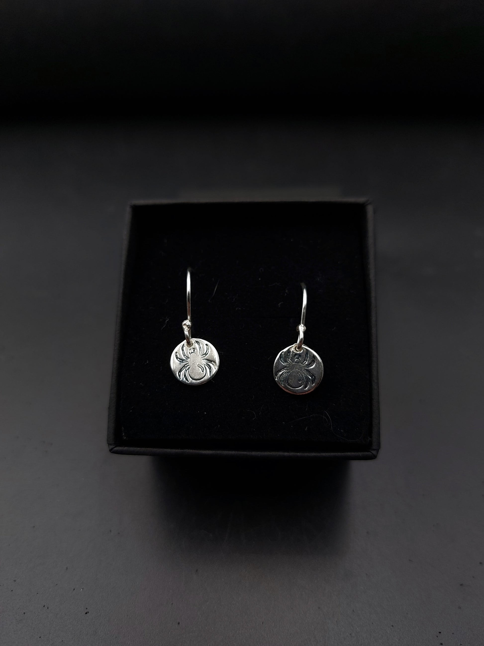 Cute little drop earrings with spider design made from sterling silver with handmade sterling silver hooks.