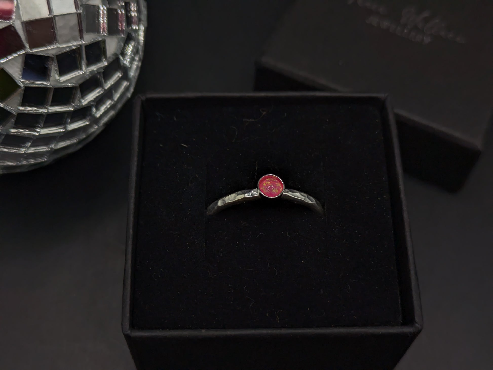I have adorned it with a 4mm wide lab created opal. The lab created opal is an ethical, affordable and colourful alternative to a natural opal.