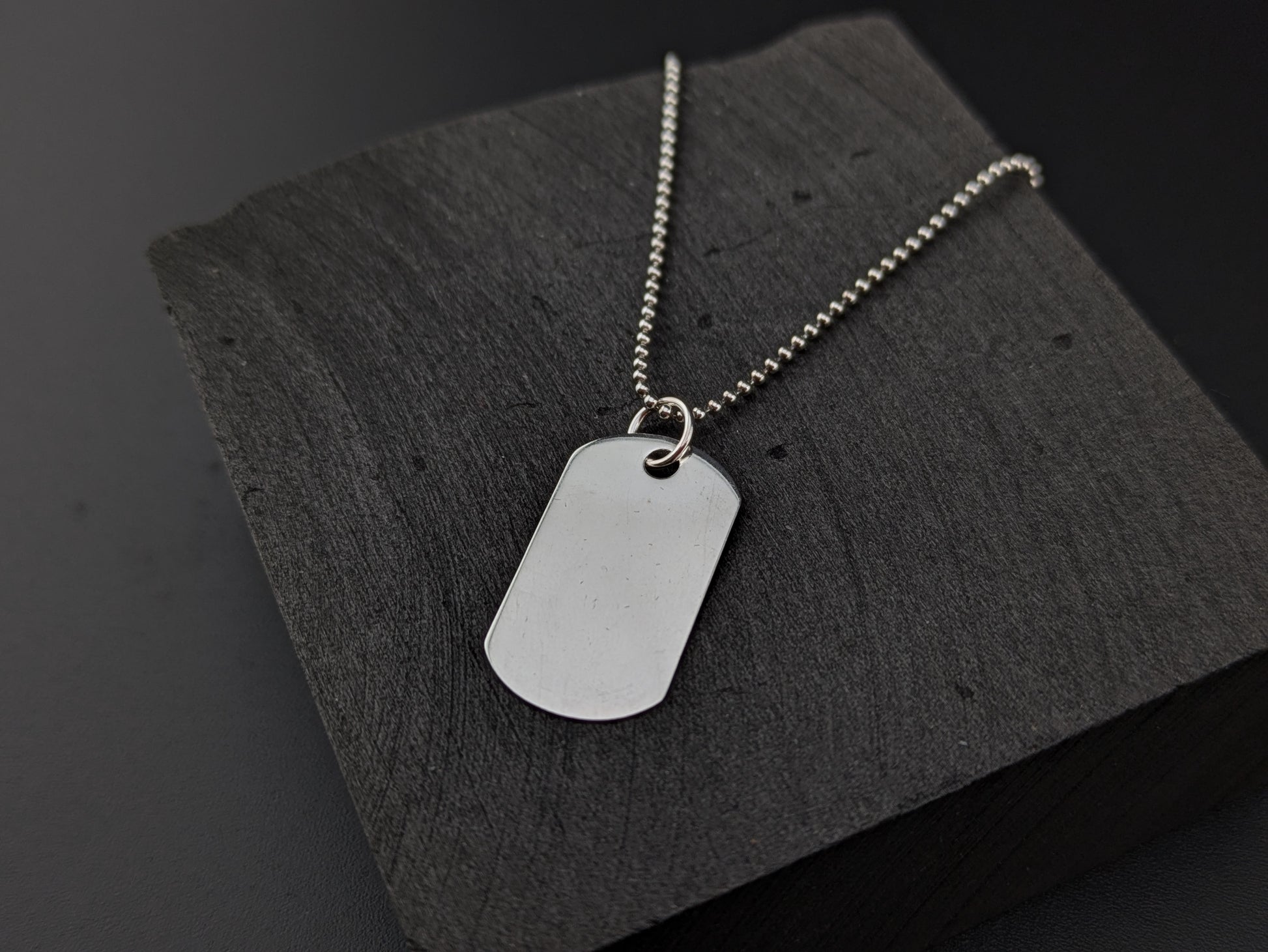 A lightweight sterling silver dog tag pendant measuring approximately 22 mm long on an optional sterling silver ball chain