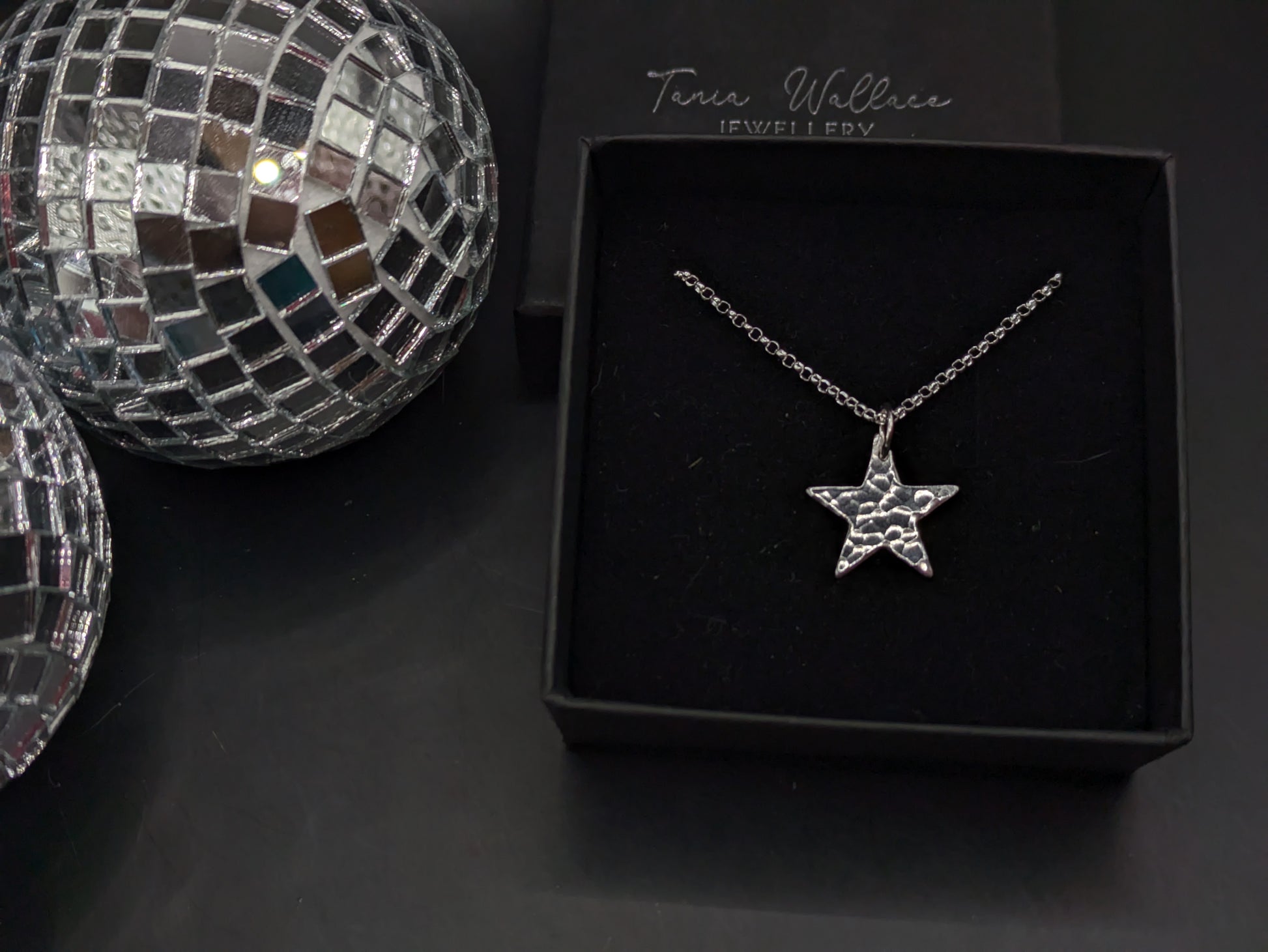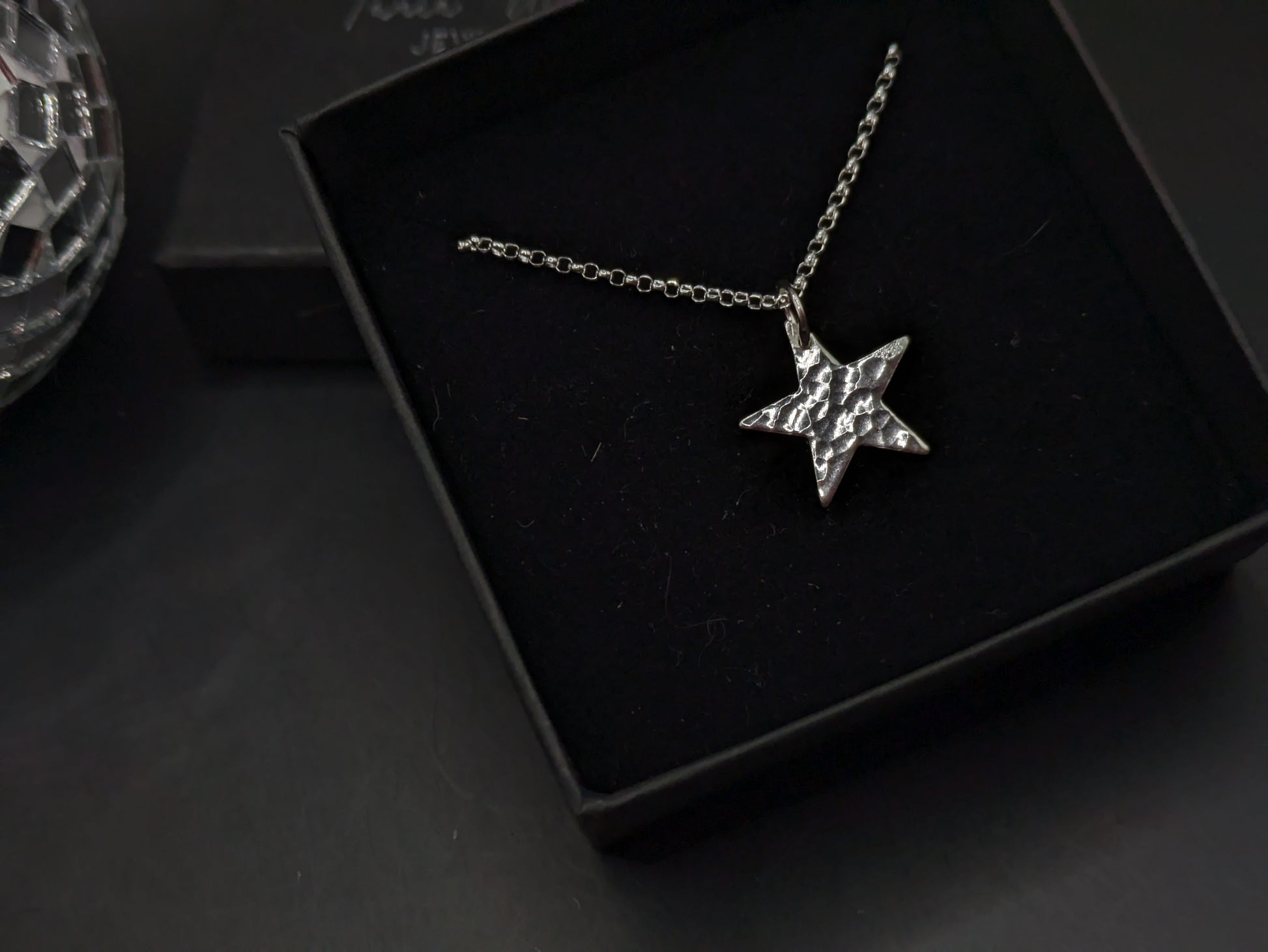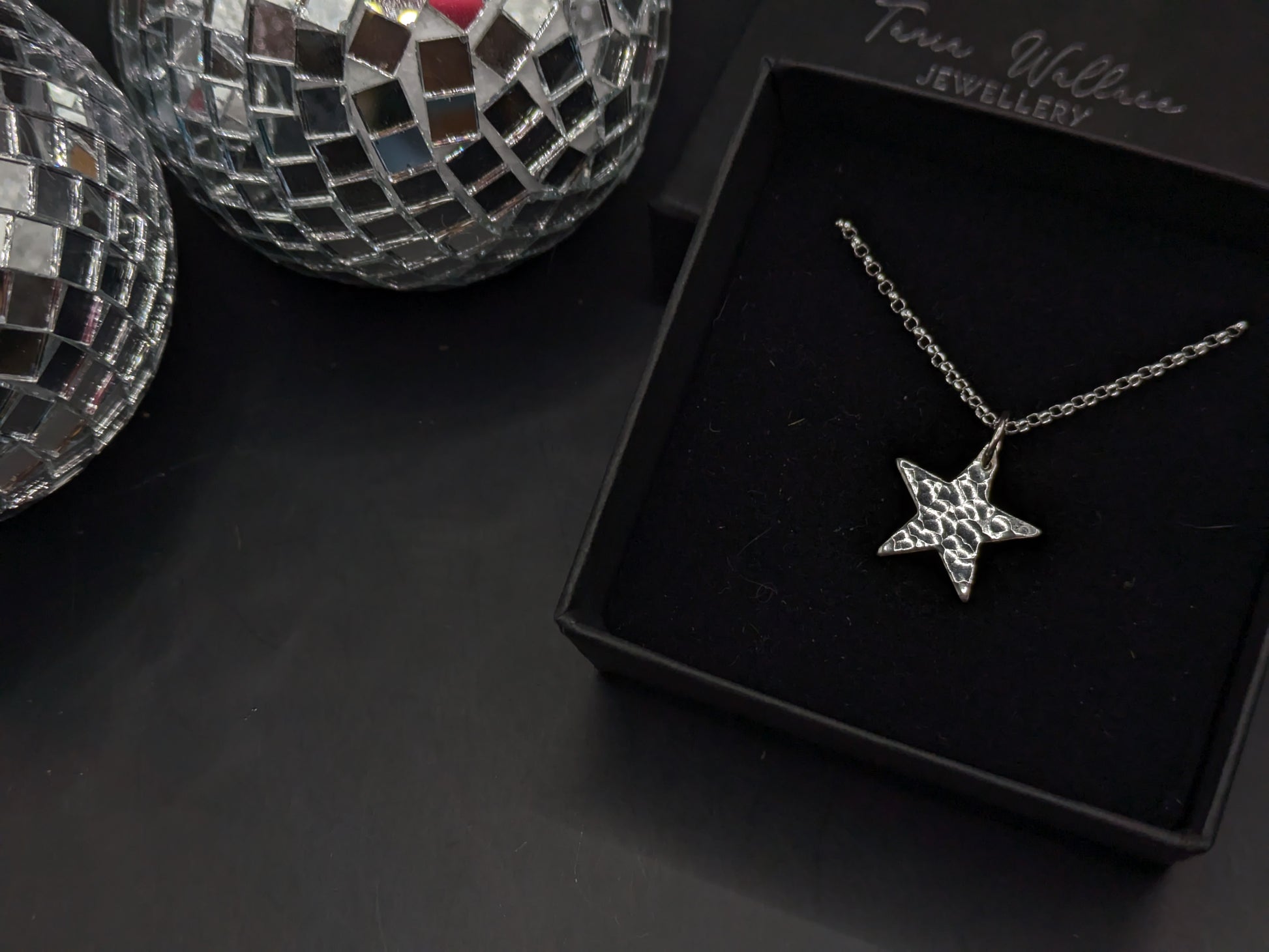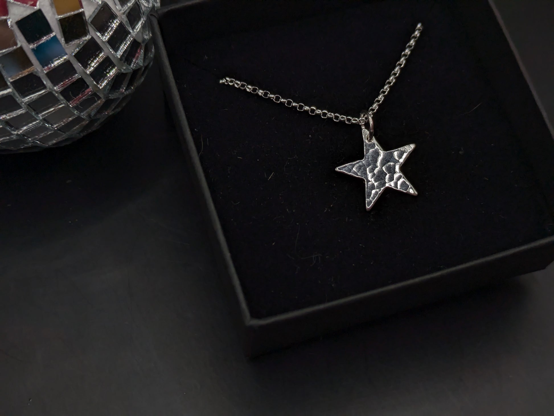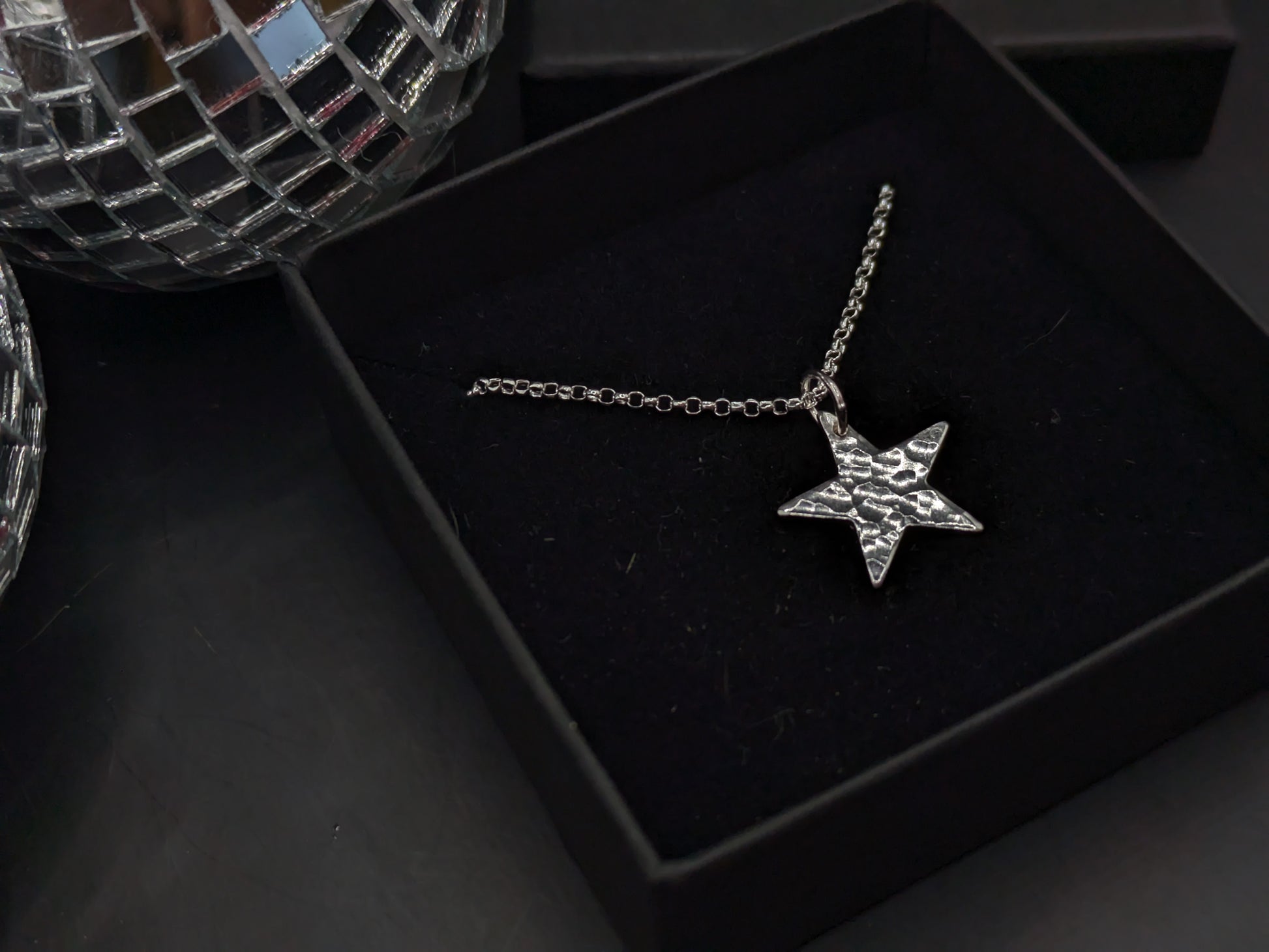 A star shaped pendant made from recycled sterling silver which I have textured by hand and then hand punched into a star shaped.