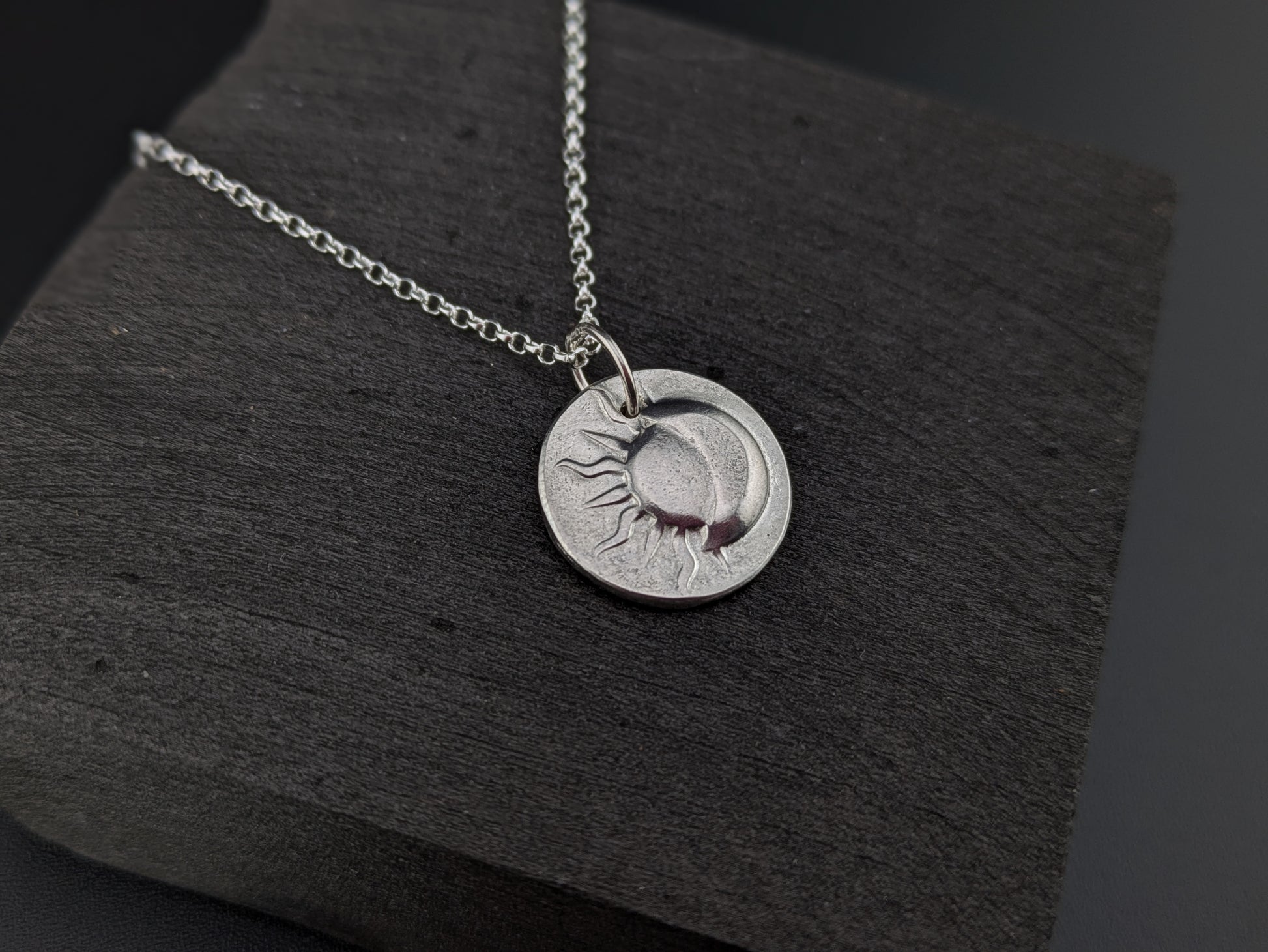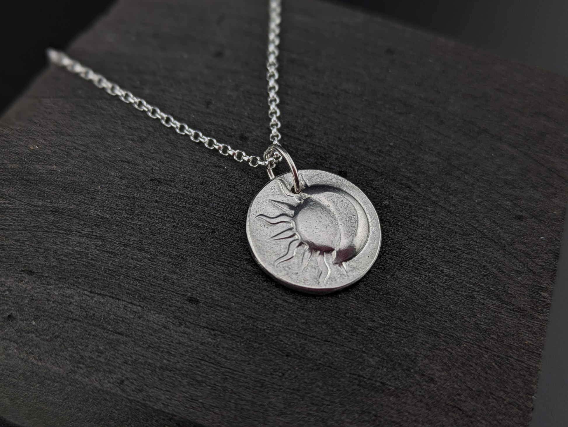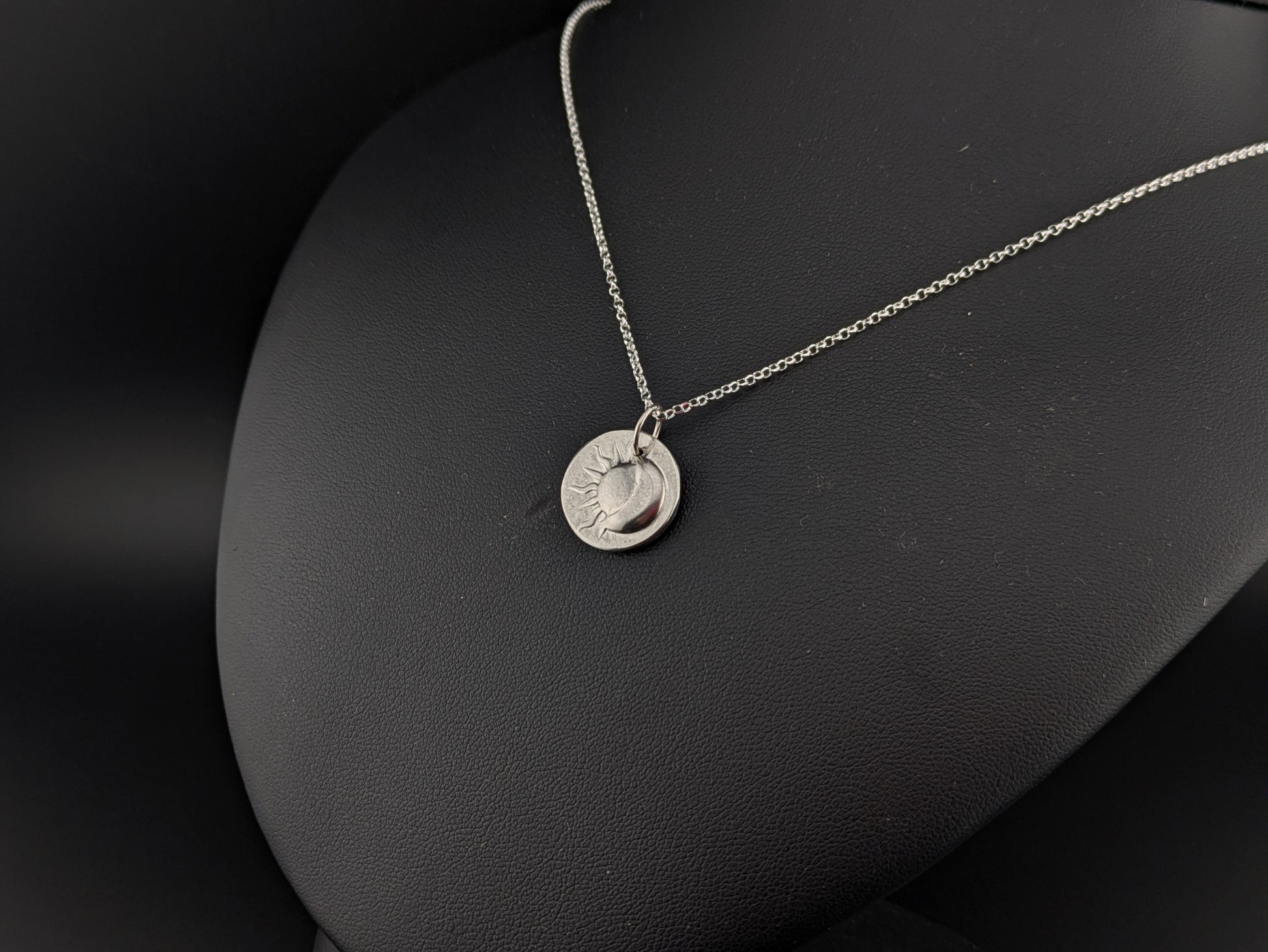 Hand pressed sterling silver disc pendant with 3d moon and sun pattern.