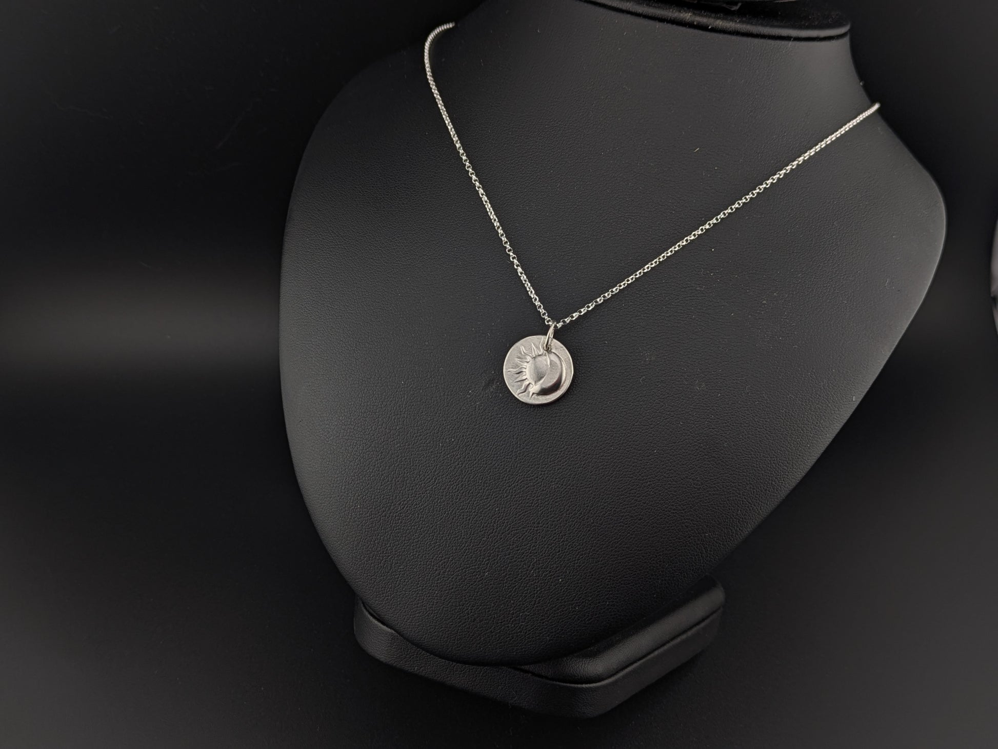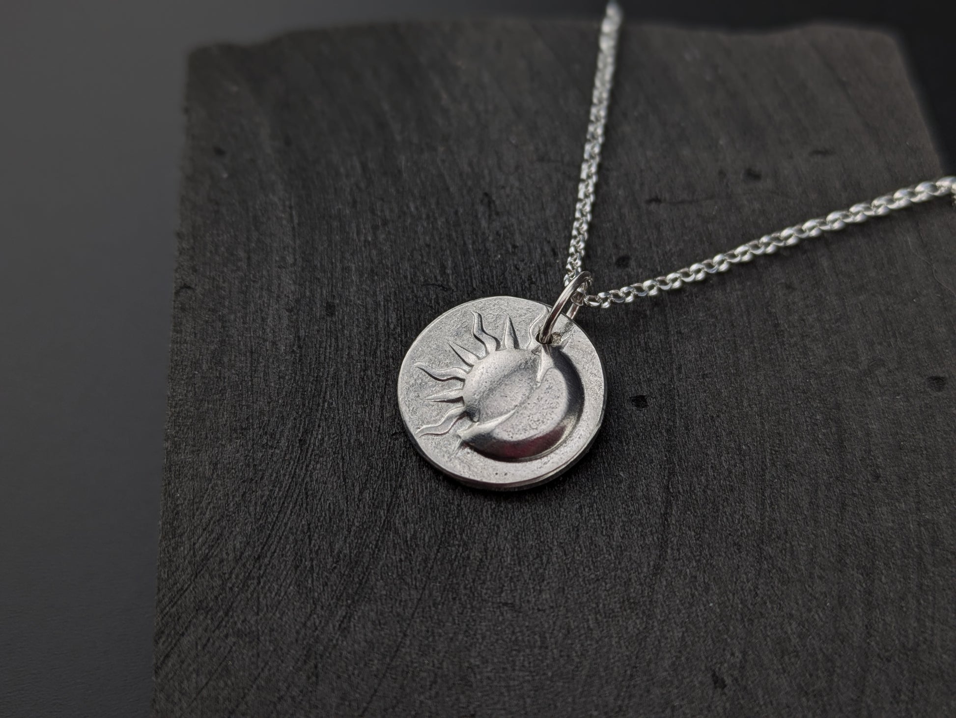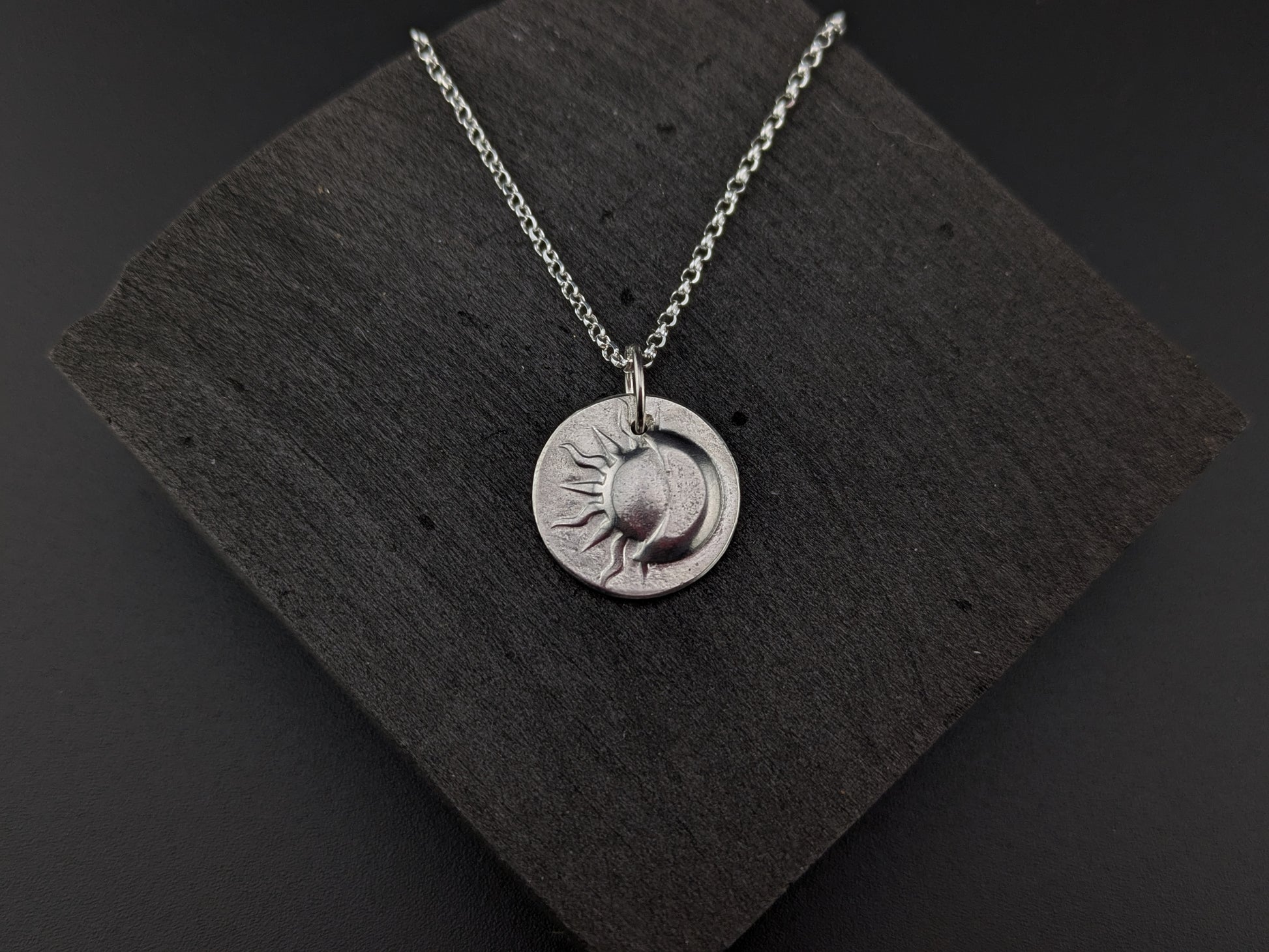 Hand pressed sterling silver disc pendant with 3d moon and sun pattern.