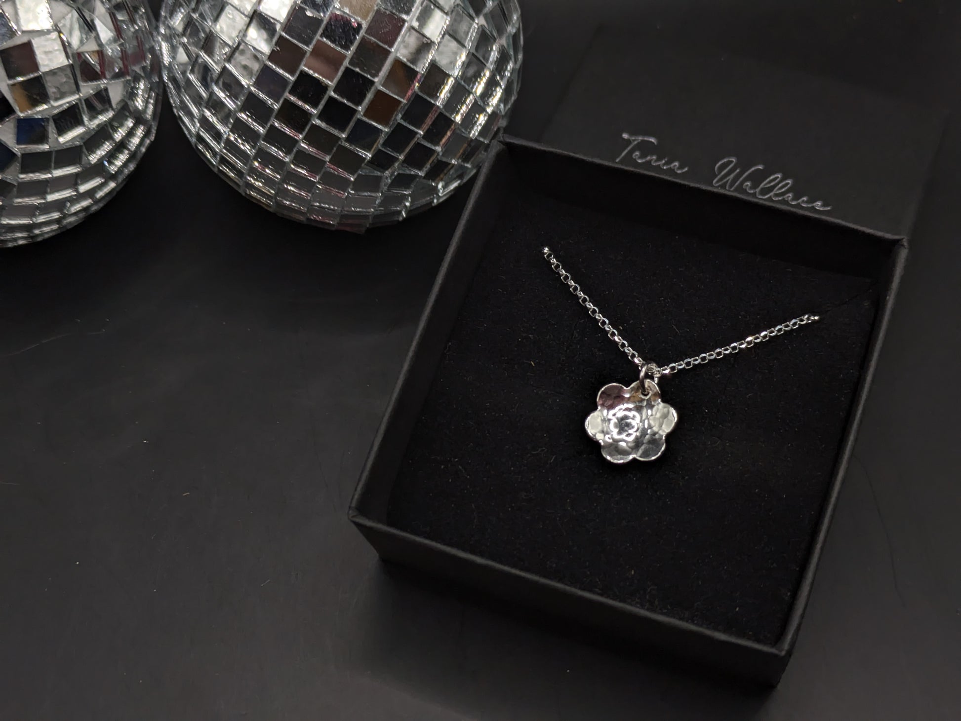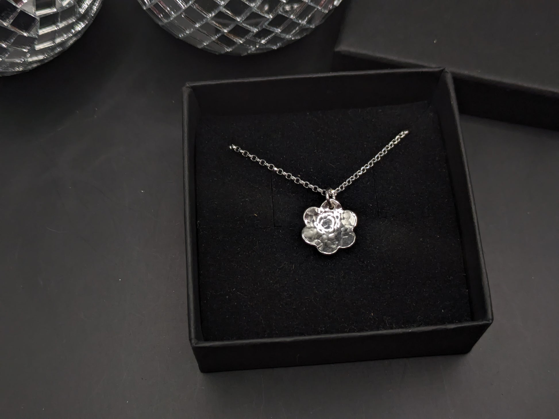 Pretty pendant in the shape of a flower which I have textured by hand and polished up to a high shine.