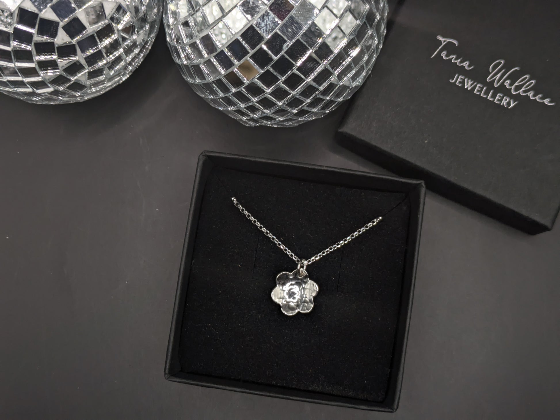 The flower is approx 1 cm wide and comes on a sterling silver chain.