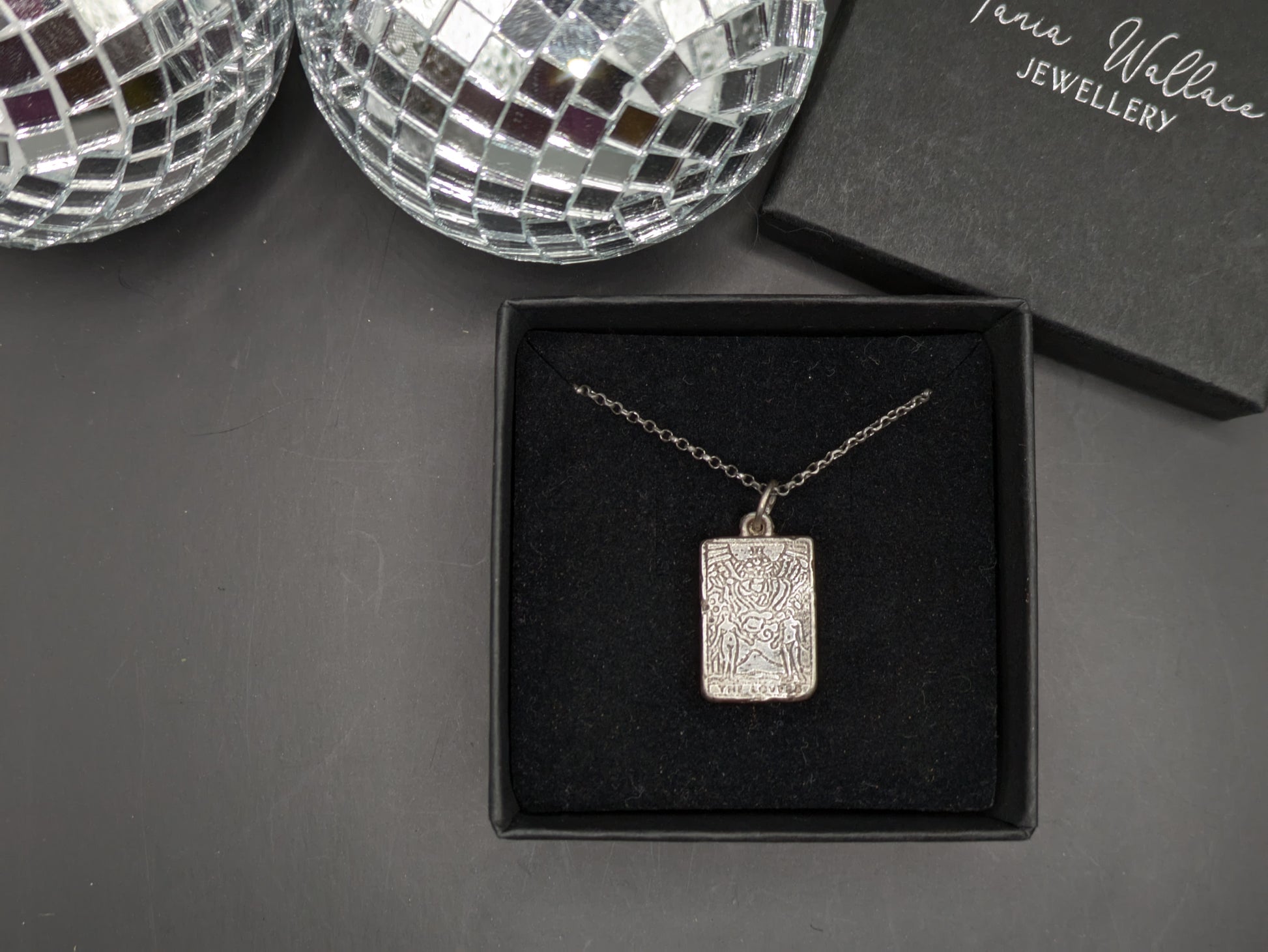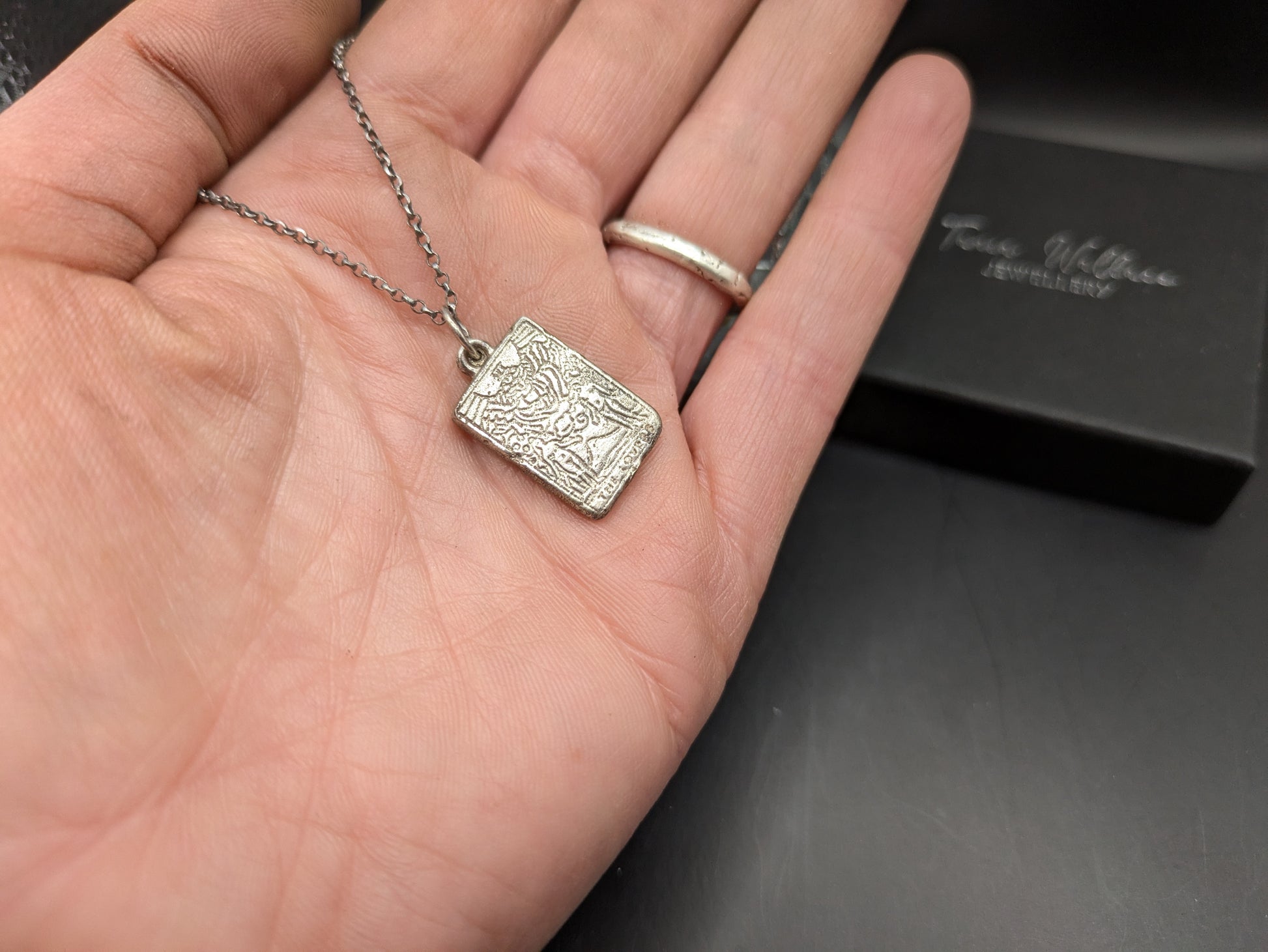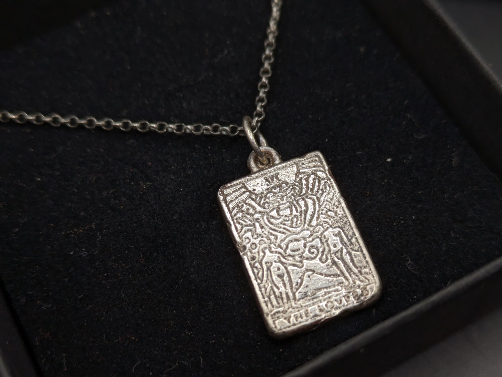 The unisex pendant is made from solid silver, I have created it by sand casting a tarot charm. I've then oxidized it and polished it up using a polishing compound. I wanted the pendant to be rustic and I didn't want to remove the darkness from the oxidisation but yet I wanted a bit of shine for it.