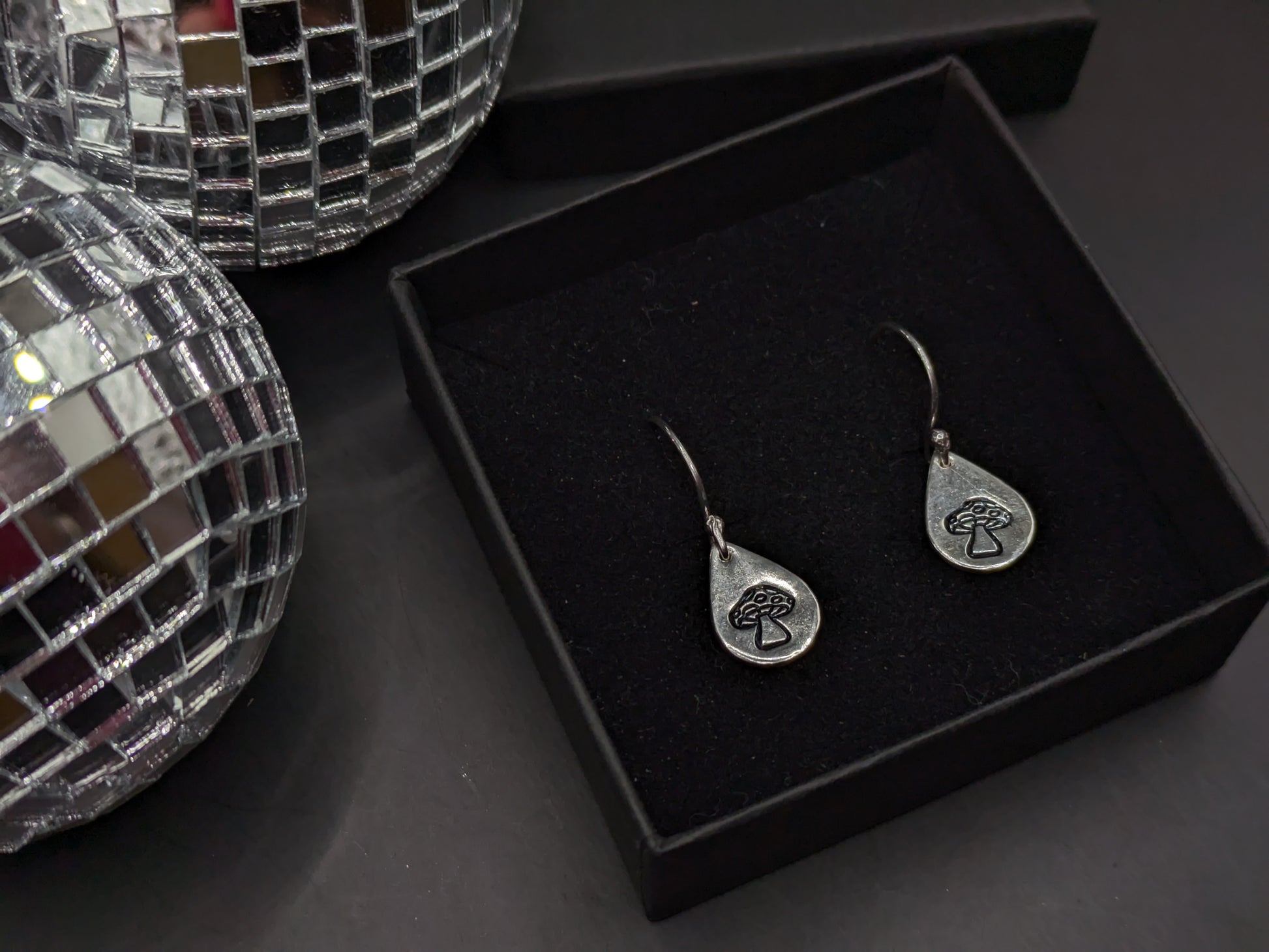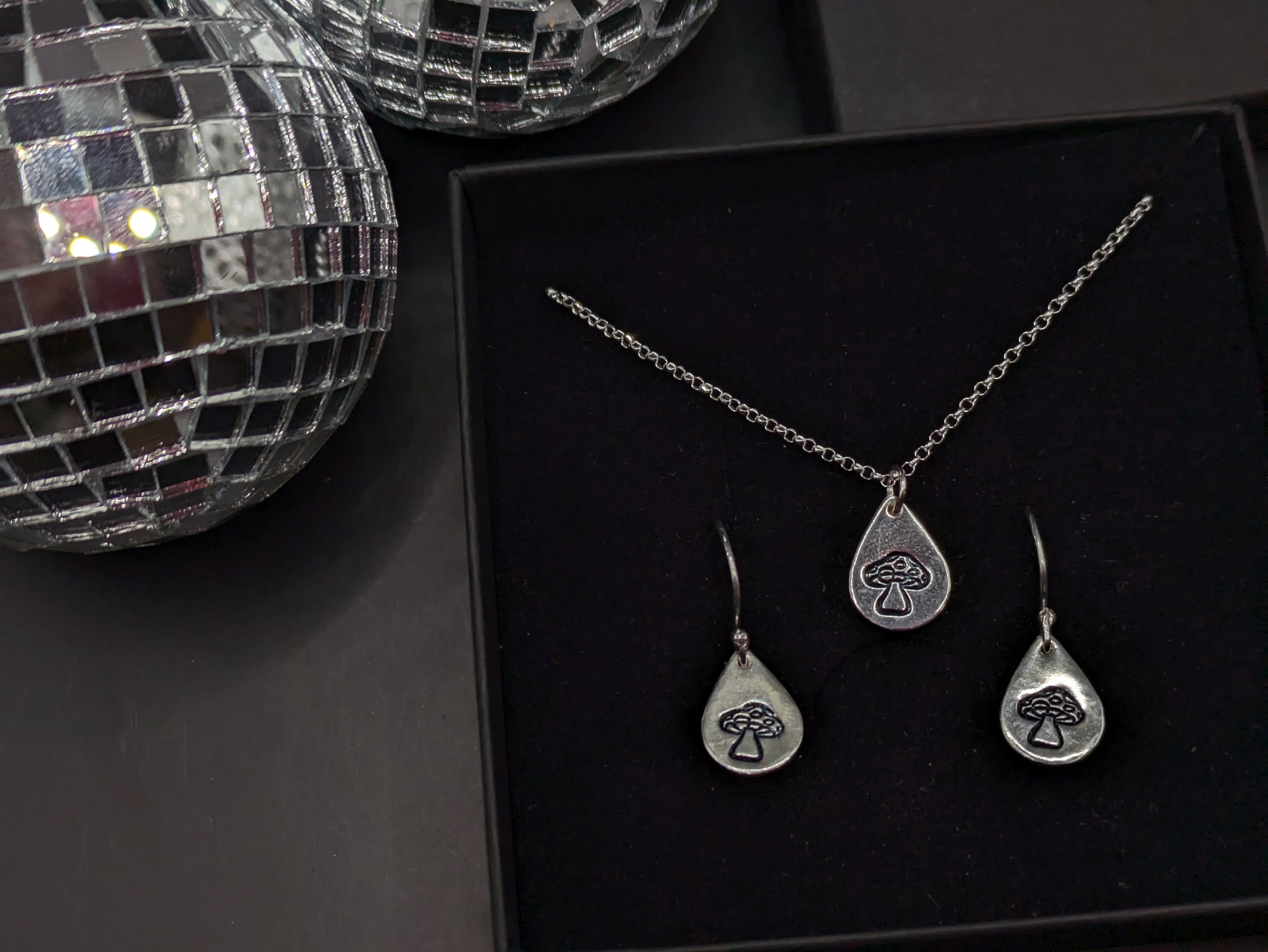 Dainty teardrop shaped sterling silver pendant and earrings with hand punched toadstool pattern darkened with enamel to highlight the detail.