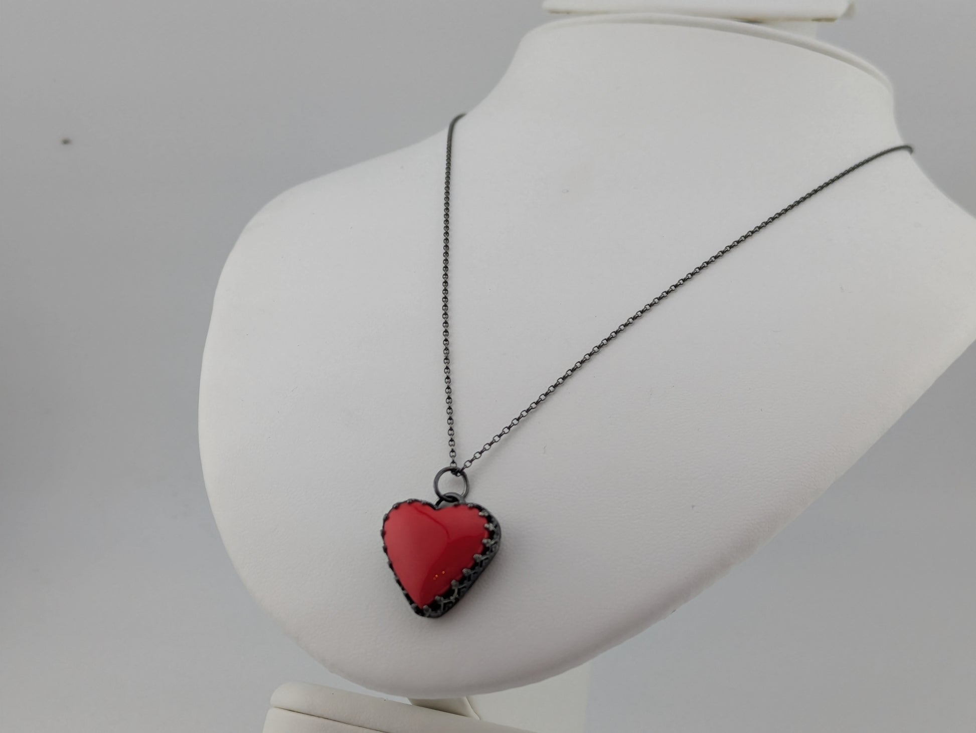 I have set the heart into sterling silver and surrounded it with pretty ornate wire which I have oxidised to darken the silver and give the red an extra bit of pow!