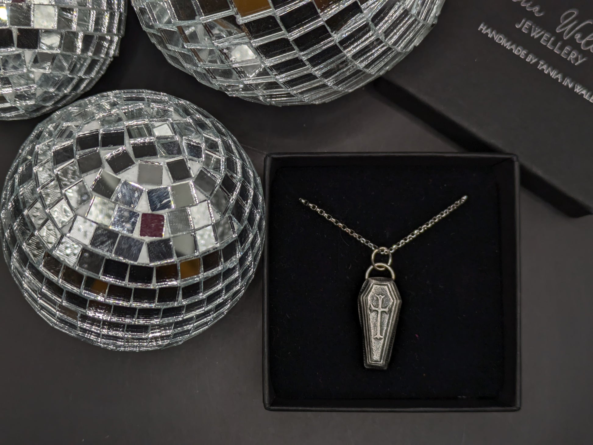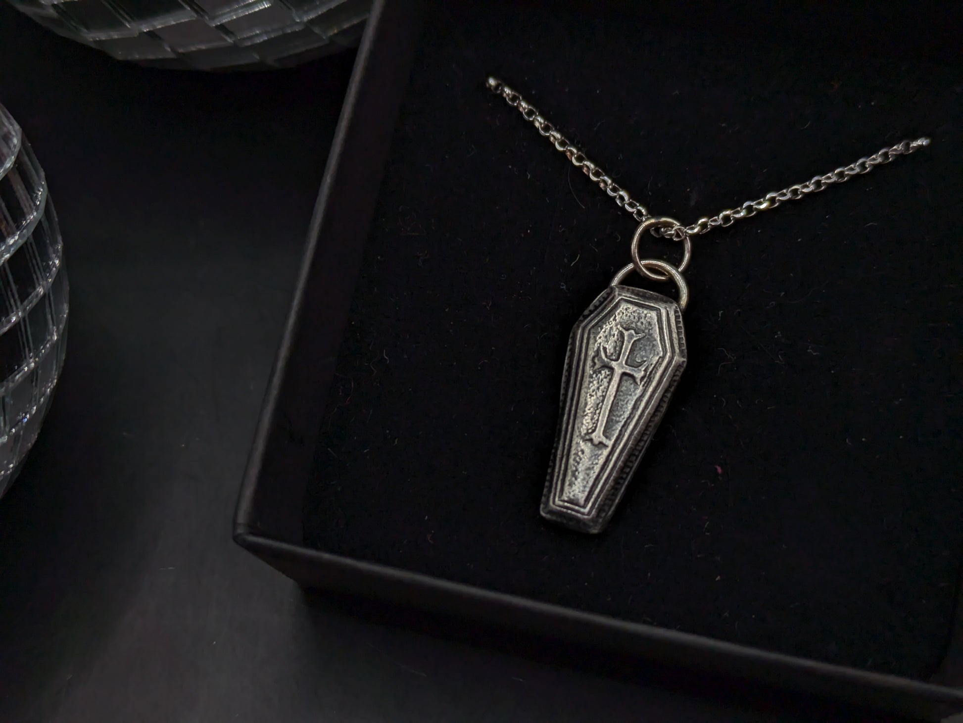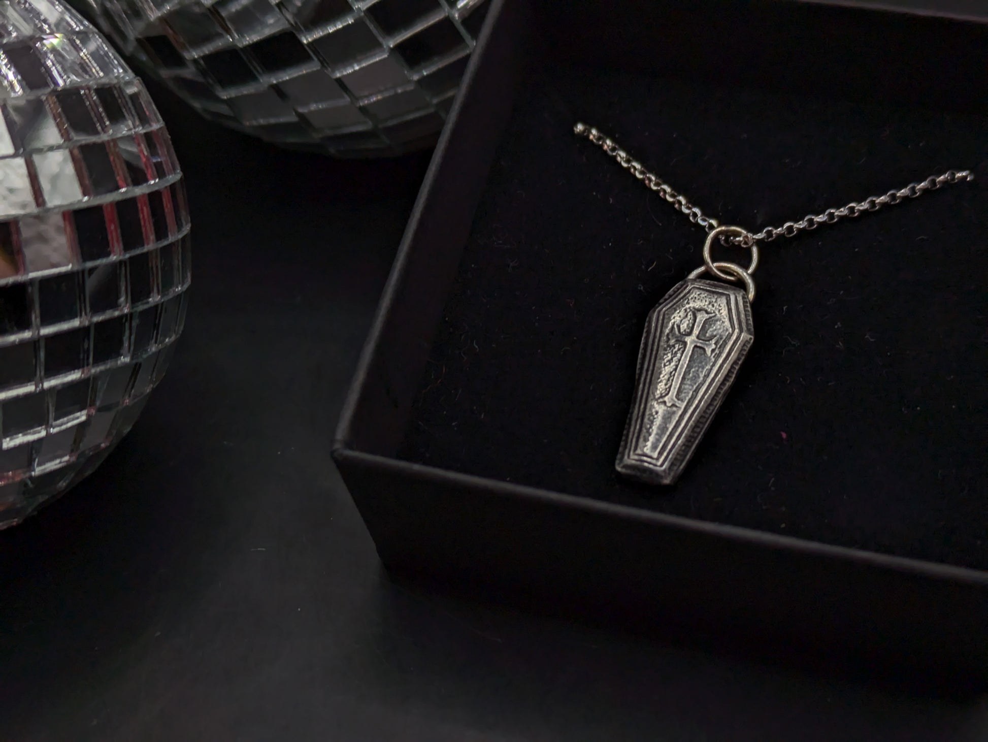 I hand carve around the coffin and solder it onto a sheet of sterling silver. I then carve, file and sand until it's smooth to the touch. I solder the hoop at the top and oxidise it to give it a good gothic darkness.