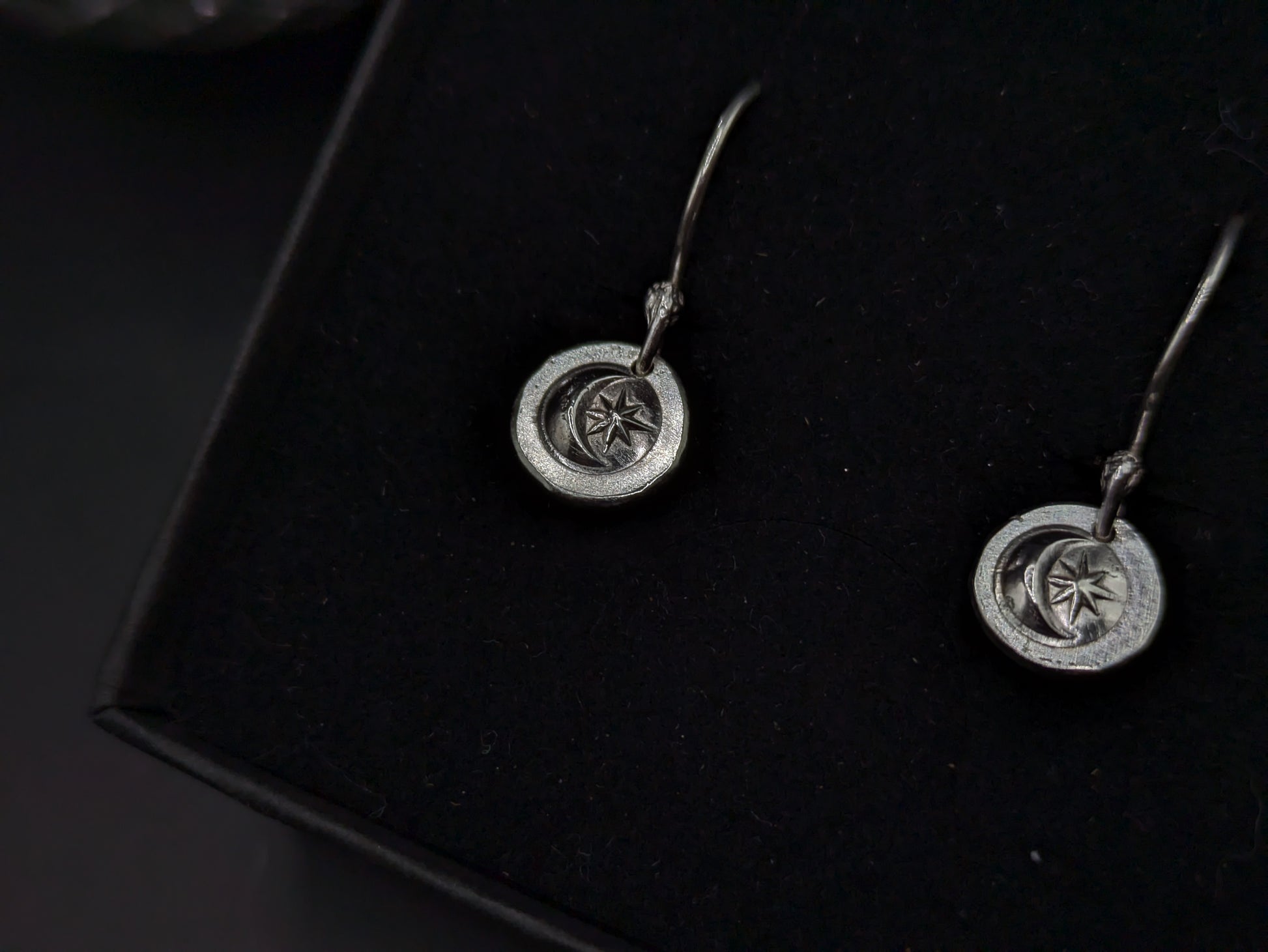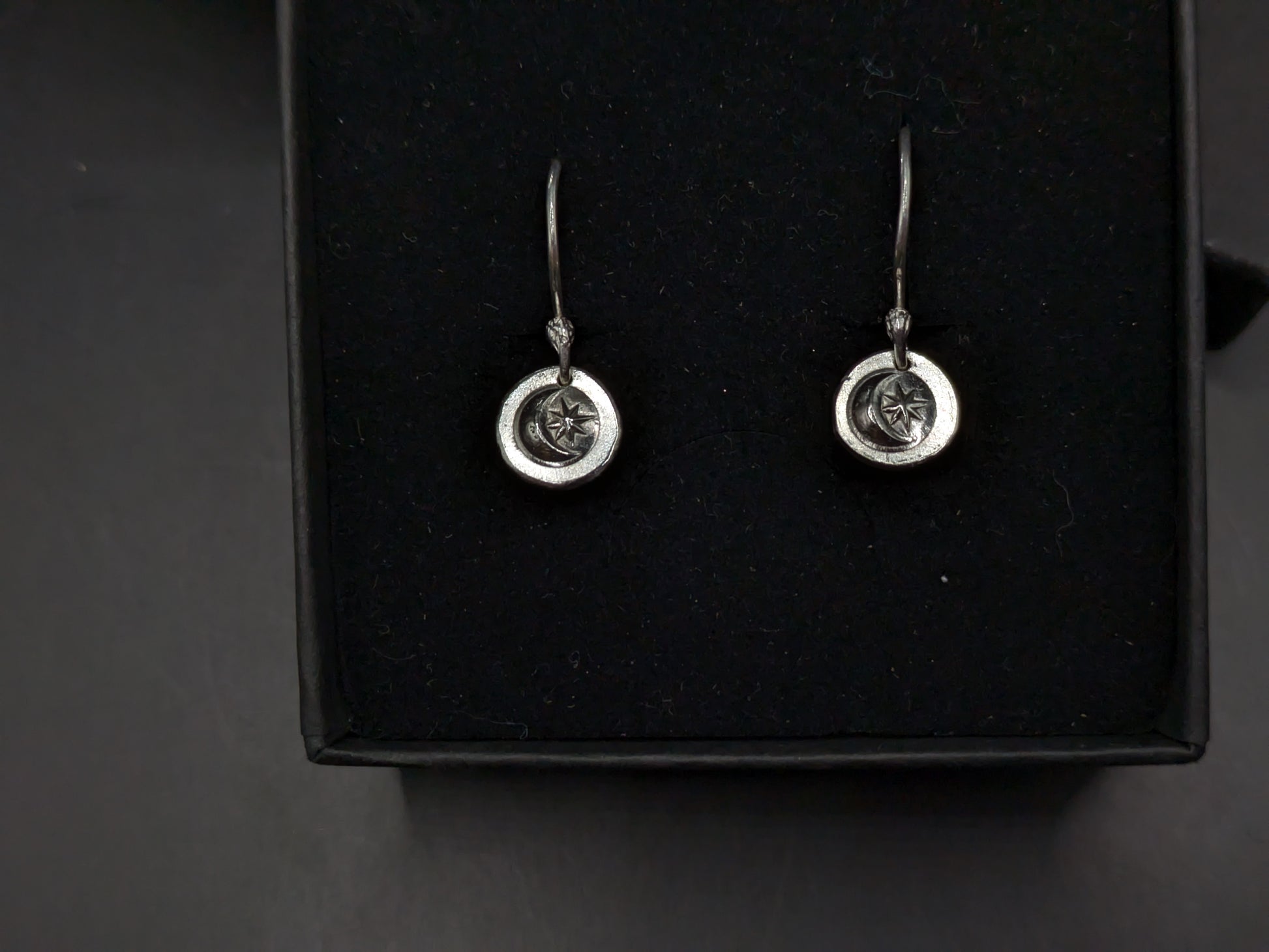 Solid silver and hand pressed drop earrings with a moon and star design. Polished by hand to bring them up to a high shine. I've also made the earrings hooks by hand from recycled sterling silver. Want them as a stud? No problem, I can do that too!